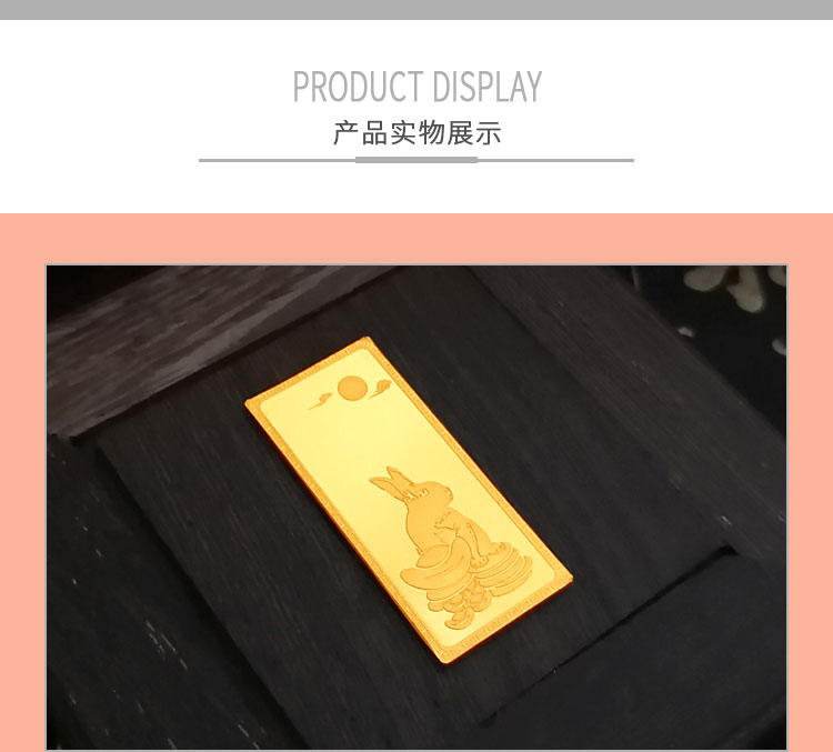 金兔納財(cái)系列金條產(chǎn)品,采用油壓工藝制造。正面圖案為一只兔子蹲坐于金錢(qián)堆上,面前擺放起元寶的造型,兔子形態(tài)機(jī)敏警惕,頭頂有環(huán)繞祥云的明月照耀。反面金兔納財(cái)四字居中,鼎泰金條印章在旁,下方標(biāo)注有金條成色、克重、編號(hào)等。整體設(shè)計(jì)寓意理財(cái)有道,納財(cái)有方,事業(yè)豐順,受福祿而身心靈動(dòng)安康,鴻福綿長(zhǎng)的美好祝愿。金條整體為鏡面底,圖案采用浮雕細(xì)砂工藝,對(duì)比效果清析,十分美觀。